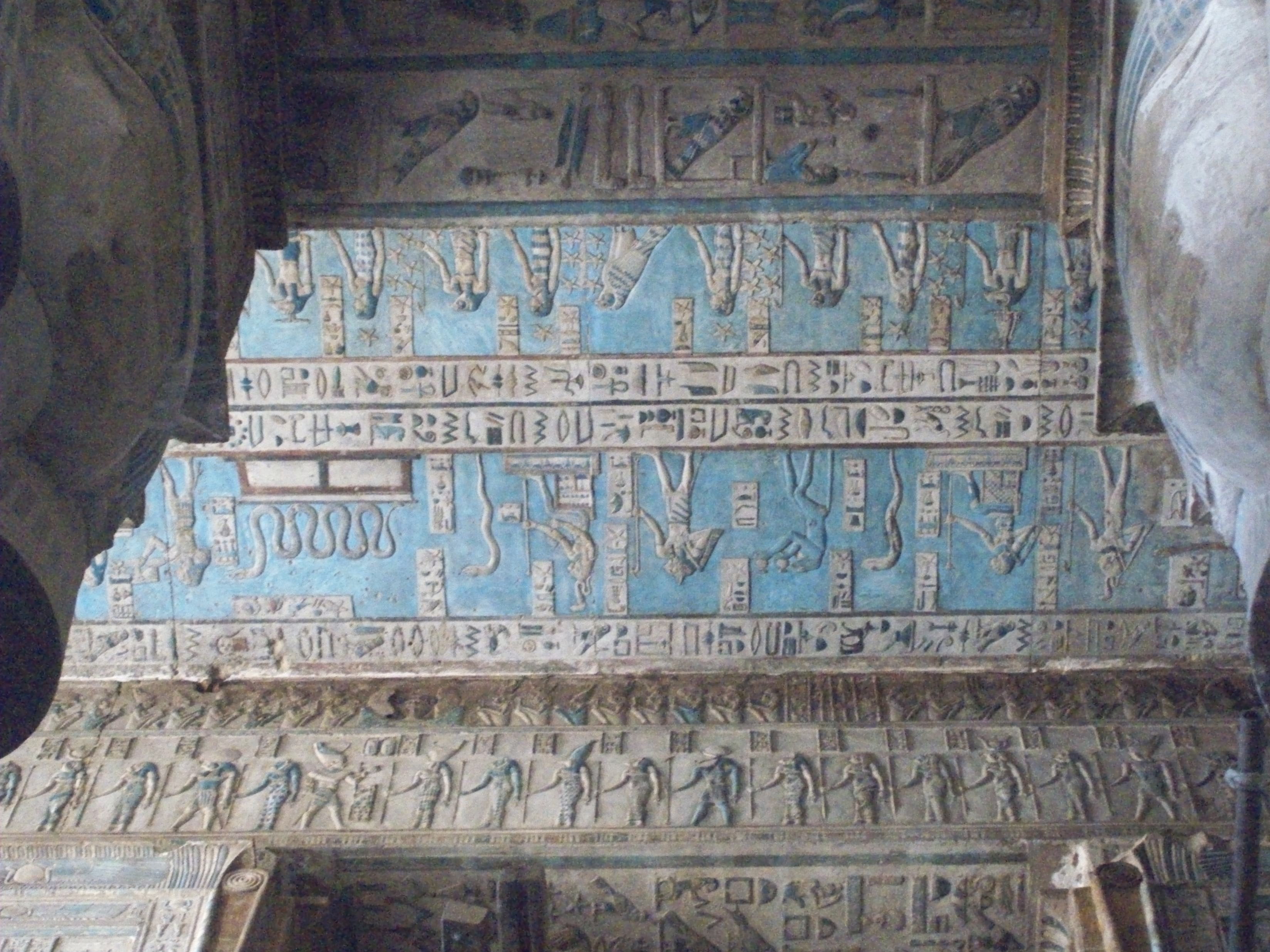 The interior walls of the great Hall represent remarkable scenes that mainly depict sacrifices being made to the goddess of the temple. The amazing ceiling with astronomical representations is also very interesting. The ceiling is divided into 7 divisions. The first division on the eastern side depicts goddess Nut, goddess of the sky, bending herself towards the earth and the sun disc is seen shining on the temple and the mask of Hathor. Next to this is a representation of the sun boat and star goddess. Next to this the western ceiling shows a divine in a perfect representation of the zodiac signs, which makes this temple one of the most famous temples. The original zodiac is in the louver museum. The 12 figures of the ram, the bull, the heavenly twins, the crab, the lion, Virgo, the scales, the scorpion, the archer, the goat, the watering pots and fishes with glittering tails. On the inner walls of the screen the hawk headed god hours and the ibis headed god Thoth are pouring drops of holy water over the king. This scene is called the baptism scene, symbolizing life and happiness.